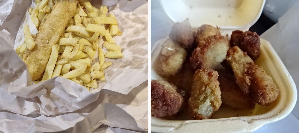 Great food - Family had chilli & chips, chicken curry & chips, burger, battered sausage, fishcakes, onion baji - all really tasty and good value (especially compared to ordering via Deliveroo/JustEat). Small chips is still a huge portion.
